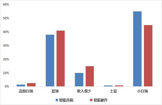 從上述圖表中可以看出,智能音箱用戶以小白領(lǐng)、藍領(lǐng)等一定消費能力的人群為主,智能音箱小白領(lǐng)用戶占比更高。