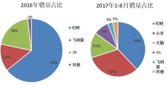 2016年整體智能音箱呈京東叮咚壟斷的趨勢,占比高達65%,飛利浦與JBL占比分別為14%、20%。2017年隨著更多廠商加入到智能音箱的市場,整體市場格局發(fā)生了改變,叮咚的市場份額降到38%,小米緊追其后,占比32%。