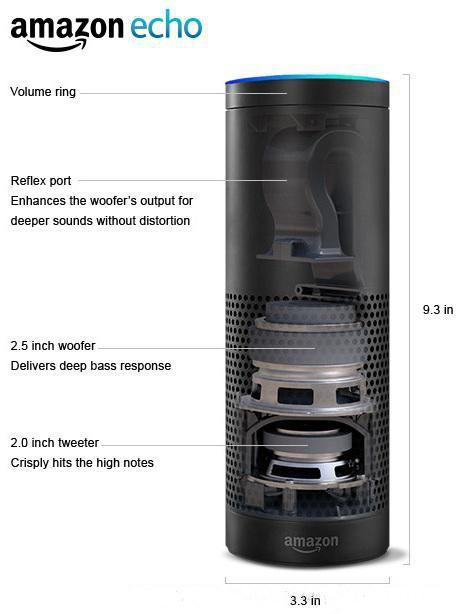 以Echo音箱為例,Echo采用封閉式揚聲器設(shè)計,高音和低音喇叭上下相對,聲音各個方向是對稱的,這有利于前端信號處理,但音效會受到限制。