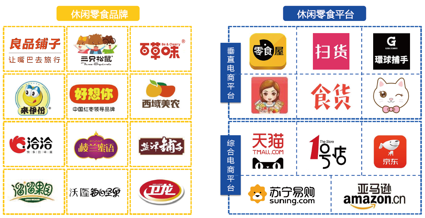 休閑零食企業(yè)主要分為兩類,品牌企業(yè)以及平臺(tái)企業(yè),平臺(tái)企業(yè)又分為綜合型電商平臺(tái)和零食類目垂直平臺(tái)。