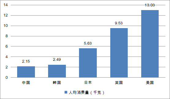 橫向?qū)Ρ任覈?guó)與世界其他發(fā)達(dá)國(guó)家休閑食品人均消費(fèi)額、消費(fèi)量可以發(fā)現(xiàn),盡管近年來(lái)中國(guó)休閑食品市場(chǎng)增長(zhǎng)較快,但與發(fā)達(dá)國(guó)家相比仍有不小的差距,增長(zhǎng)空間較大。目前,我國(guó)休閑食品人均消費(fèi)量為2.15千克,較為接近韓國(guó)的2.49千克,但與日本(5.63千克)、英國(guó)(9.53千克)、美國(guó)(13.03千克)相比差距仍較大。