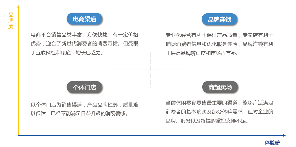 休閑零食的渠道陣營(yíng)主要有四大類:傳統(tǒng)的個(gè)體門店和商超賣場(chǎng),新興的品牌連鎖和電商渠道。在新零售浪潮的沖擊下,四大陣營(yíng)此消彼長(zhǎng),個(gè)體門店的市場(chǎng)份額不斷縮減,商超賣場(chǎng)的渠道影響力也將減弱,品牌連鎖和電商渠道將成為未來(lái)休閑零食新消費(fèi)的主流渠道。