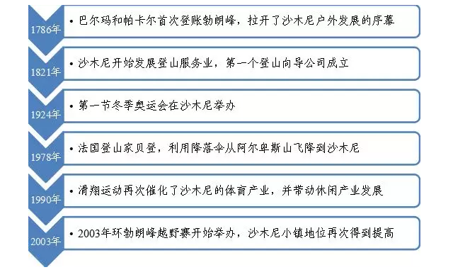 沙木尼的作為特色小鎮(zhèn)的最初起源,來自1786年8月當?shù)孬C人巴爾瑪和醫(yī)生帕卡爾兩人首次登上勃朗峰;1821年開始,沙木尼開始發(fā)展登山服務(wù)業(yè),小鎮(zhèn)內(nèi)34名的本地向?qū)ЫM成了一個向?qū)Ч荆?924年第一屆冬季奧運會在沙木尼舉辦,世界性的滑雪教練訓(xùn)練中心也在這里落戶。至此,沙木尼的特色小鎮(zhèn)地位已經(jīng)基本