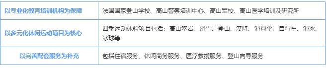 在法國,登山向?qū)︻櫩偷男袨槌袚韶熑?,這些以技術(shù)高超、經(jīng)驗豐富,責任感強而著稱的向?qū)冊谌澜缍枷碛惺⒆u。國立登山滑雪學(xué)校開設(shè)的項目有登山向?qū)?、滑雪教練、高山協(xié)作、救援、滑翔傘教練。學(xué)校設(shè)備齊全,配有六個可容納20至80人的會議室、一個可容納220人且配有錄像投影機的階梯教室、一棟配有132個標間的宿舍樓、一個自助餐中心、一個健身房、一個器材室及其它科研場所。因為ENSA的存在,沙木尼成為全球登山標準的定制者,完善的培訓(xùn)和卓越的服務(wù)成為其登山產(chǎn)業(yè)發(fā)展的護城河。