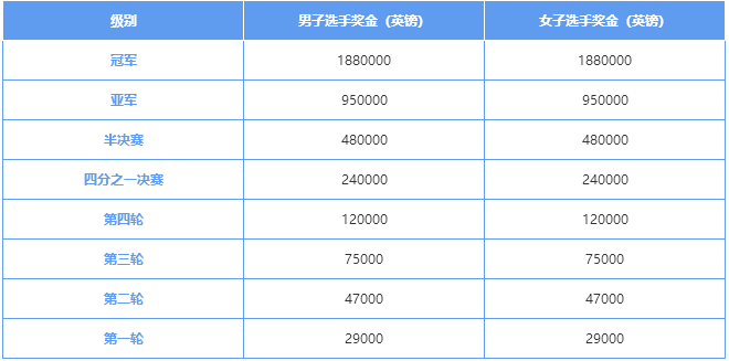 溫網(wǎng)不斷攀升的獎金也是吸引選手參賽的一大因素。1984年,溫網(wǎng)男子單打冠軍獎金為10萬英鎊,女子單打冠軍為9萬英鎊;1985年男單冠軍為13萬英鎊;1987年男單冠軍獎金為15.5萬英鎊;1991年男單冠軍獲24萬英鎊,女單冠軍獲21.6萬英鎊,甚至第1輪遭淘汰選手也可獲得一筆獎金,男子3600英鎊,女子2790英鎊。如今,溫網(wǎng)已經(jīng)實現(xiàn)了男女運動員獎金持平政策,每年共有2700萬磅獎金,已經(jīng)超過美網(wǎng)(2600萬磅)、澳網(wǎng)(2300萬磅)、法網(wǎng)(2200萬磅)成為獎金最多的公開賽。