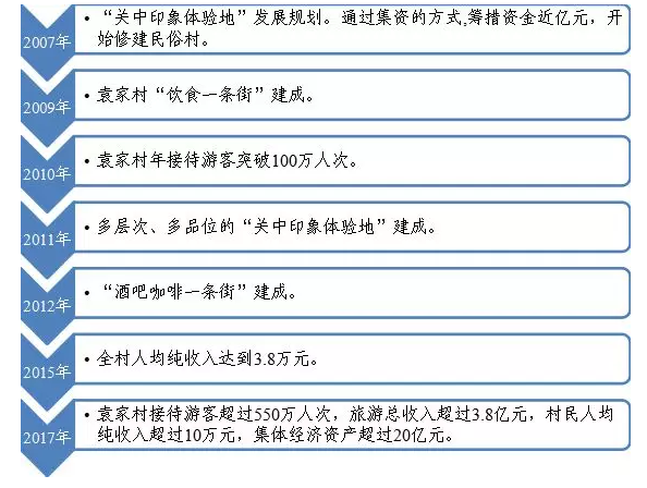 袁家村從2007年開始由村委書記帶領(lǐng)發(fā)展鄉(xiāng)村旅游,通過將關(guān)中的特有民俗小吃、技藝等與現(xiàn)代文化創(chuàng)意、休閑生活方式相結(jié)合,形成了現(xiàn)在的年游客量過百萬、收入過億的關(guān)中民俗特色文化旅游小鎮(zhèn)。