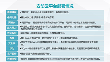 當(dāng)前平安城市和智慧城市的建設(shè)中,智能化分析已經(jīng)得以大量應(yīng)用,大量實(shí)例證明智能化分析在城市視頻監(jiān)控中的必要性。但目前安防,智能化不足是安防行業(yè)的主要頑疾之一,更加智能化將是未來發(fā)展方向和創(chuàng)新點(diǎn)。 另一方面,平安城市和智慧城市建設(shè)的重心已經(jīng)從前端的攝像頭等硬件設(shè)備向后端聯(lián)網(wǎng)平臺(tái)系統(tǒng)轉(zhuǎn)移。未來云平臺(tái)將成為安防企業(yè)競(jìng)爭(zhēng)的核心。多家企業(yè)已開始布局安放云平臺(tái)通過云平臺(tái)可以引申出一系列配套的產(chǎn)品、服務(wù)和解決方案,未來平臺(tái)建設(shè)能力較強(qiáng)的廠商可通過將平臺(tái)免費(fèi)提供給用戶使用,而由于平臺(tái)轉(zhuǎn)換成本高,這將大大增加用戶的使用粘性。