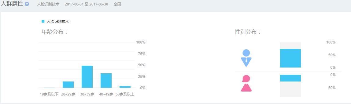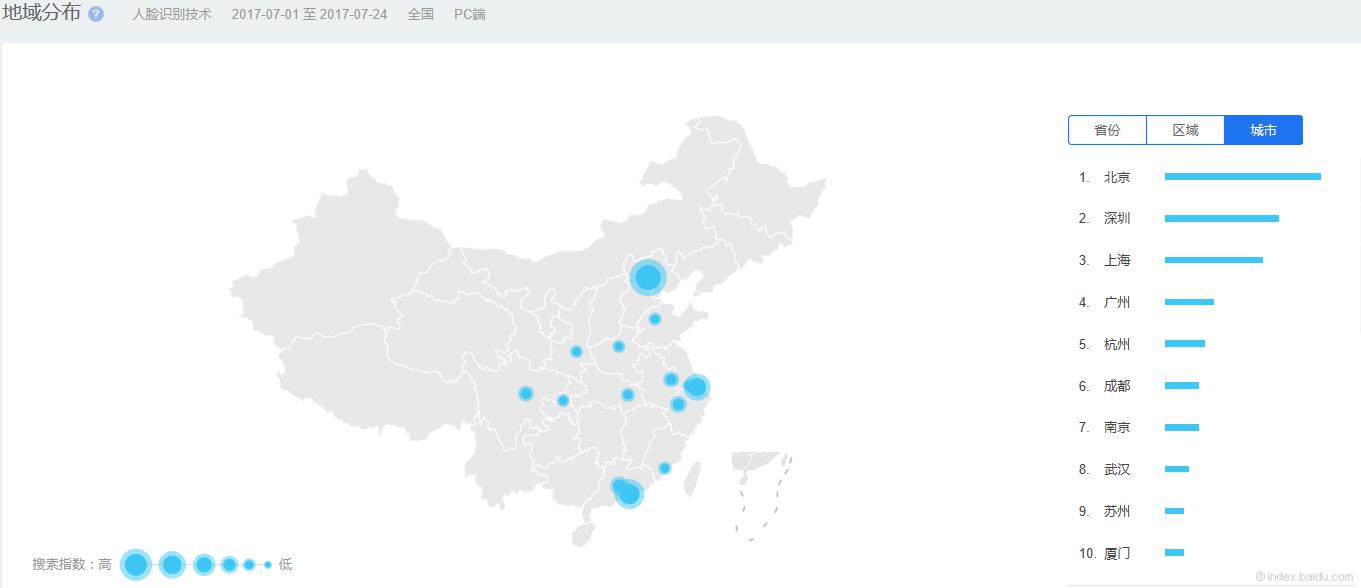 根據百度數據顯示,市場對于人臉識別技術的關注度,根據地域分布,主要集中在北京、深圳、上海、廣州、杭州等城市;根據年齡和性別分布,主要集中在男性青年群體。
