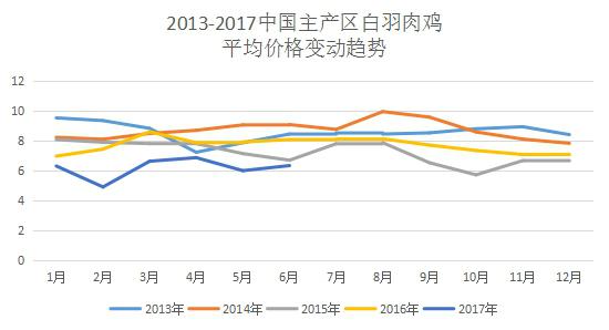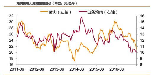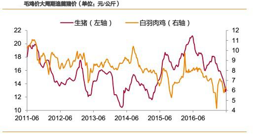 2)短周期內(nèi),受各自供求關(guān)系決定產(chǎn)品價(jià)格,則豬價(jià)、雞價(jià)走勢有可能會發(fā)生背離,但背離時(shí)間一般不會超過1個(gè)季度,且背離的時(shí)間一般出現(xiàn)在春節(jié)后的上半年。如2012年2月-4月,2014年2月-4月、2015 年3月-6月、2016年3月-6月、2017年2月-3月。