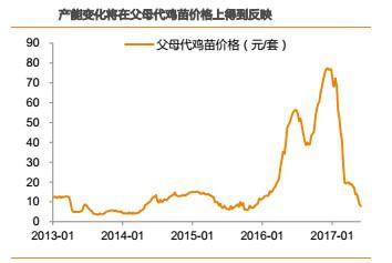 引種規(guī)模的下降意味著祖代存欄的下降,供給的減少將導(dǎo)致父母代雞苗銷售價(jià)格下降。由于2012年以前國內(nèi)白羽肉雞需求快速增加,因此,國內(nèi)白羽雞引種規(guī)增速的下降也會引起價(jià)格的上漲。例如,2010年的引種規(guī)模與2009年基本持平,僅增長3萬套。受此影響,父母代雞苗價(jià)格也從2010年9月份開始反彈。同樣的,隨著2014年引種規(guī)模的下降,父母代雞苗價(jià)格則從2014年3月見底回升,中間雖有波動(dòng),但從2015年10月即開始一輪快速上漲。也就是說,對于祖代產(chǎn)能的變化,父母代雞苗價(jià)格是一個(gè)重要的驗(yàn)證指標(biāo)。