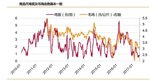 理論上,在產(chǎn)父母代存欄的變動(dòng),3周后將傳導(dǎo)到雞苗環(huán)節(jié)。但實(shí)際上,由于商品代離消費(fèi)者最近,需求端的影響要大于供給端的影響。從數(shù)據(jù)上看,雖然商品代雞苗由于沒有庫存,產(chǎn)品價(jià)格波動(dòng)幅度遠(yuǎn)大于毛雞價(jià)格的波動(dòng)幅度,但是兩者之間的走勢卻基本一致,間隔最多不會超過1周。因此,判斷毛雞價(jià)格走勢基本等價(jià)于判斷雞苗價(jià)格。