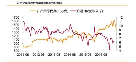 在產(chǎn)父母代存欄是商品代的直接產(chǎn)能,代表了中短期的供給能力。理論上,經(jīng)過3周孵化期+6 周育肥期后毛雞出欄,則在產(chǎn)父母代存欄是毛雞價(jià)格提前9-10周的先行指標(biāo),與毛雞價(jià)格走勢呈反相關(guān)。從實(shí)際運(yùn)行來看,理論上走勢與實(shí)際走勢大體吻合。因此,在產(chǎn)父母代存欄是相對于毛雞價(jià)格提前兩個(gè)多月的先行指標(biāo)。