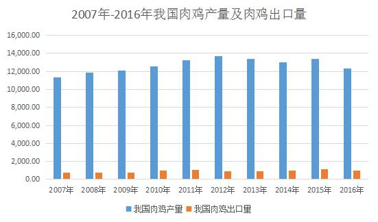 從2007年開始,受H7N9疫情和成本快速上升等因素的困擾,中國雞肉生產(chǎn)進(jìn)入了平穩(wěn)發(fā)展時(shí)期,雖然增長速度有所減緩,但是增長趨勢依然強(qiáng)勁。2007年至2012年,我國雞肉年產(chǎn)量及消費(fèi)量持續(xù)增長,2013年以來受疫情、中央八項(xiàng)規(guī)定等因素的影響,雞肉年產(chǎn)銷量略有下降,但始終保持在1,300萬噸以上的水平。雞肉產(chǎn)量從2007年的11291千噸增長至2016年的12300千噸,雞肉消費(fèi)量從2007年的11773千噸增長至2016年的12730千噸。