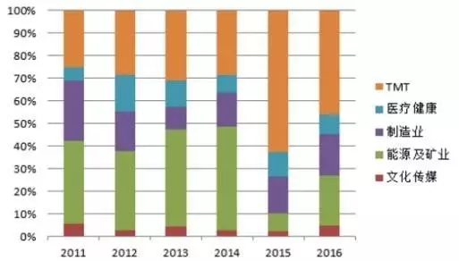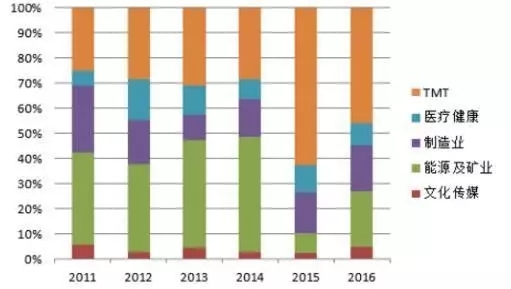 在國內(nèi) PE 投資方面,2016年TMT 行業(yè)投資熱度有所降低,但這與 2016 年市場(chǎng)整體投資節(jié)奏放緩有一定關(guān)系。如果從投資 的行業(yè)占比來看,TMT 和制造業(yè)仍然是最受投資機(jī)構(gòu)追捧的領(lǐng)域。