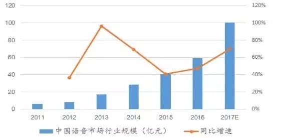智能語音技術(shù)作為一種更為自然的人機(jī)交互方式,其下游應(yīng)用廣泛,包括智能車載市場(chǎng)、智能家居、智能可穿戴設(shè)備、智能 個(gè)人助理等。2017 年中國語音市場(chǎng)行業(yè)規(guī)模有望突破 100 億 元,同比增速高達(dá) 70%左右,維持高速增長勢(shì)頭。從 2011 年到 2017 年市場(chǎng)規(guī)模年均復(fù)合增速約為 59%。