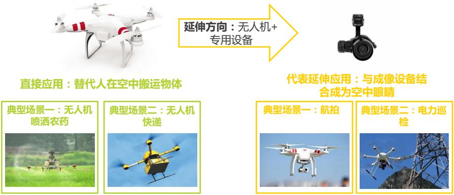 無人機價值在于替代人類完成空中作業(yè),并且能夠形成空中平臺,結合其他部件擴展應用。