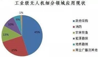 目前,工業(yè)級無人機細分領域中,政府采購占比45%,消防占比25%,農(nóng)林牧漁占比13%,能源勘探占比10%,地質勘測占比6%,商業(yè)廣播及其他占比1%。