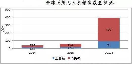 2015年,民用無人機銷量約為56.9萬架,其中,工業(yè)級無人機銷量約為17.1萬架,消費級無人機銷量約為39.8萬架。據(jù)IDC預測,到2019年全球民用無人機銷量預計可達393萬架,其中,消費級約為300萬架,年均復合增長率為60%,工業(yè)級約為93萬架,年均復合增長率為45%。