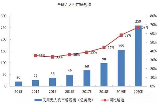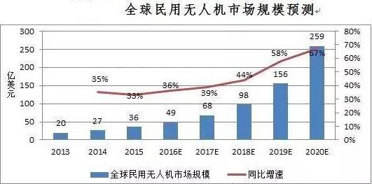 2015年,全球民用無人機市場規(guī)模為36億美元,同比增長33%。據(jù)中國產(chǎn)業(yè)信息網(wǎng)預測,到2020年全球民用無人機市場規(guī)模預計可達259億美元,年均復合增長率為42%。