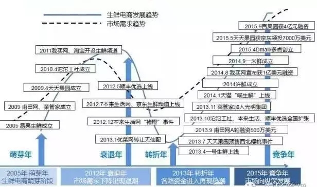 2005年,易果網(wǎng)成立,2008年,出現(xiàn)了專注做有機食品的和樂康及沱沱工社,這幾個企業(yè)都專注于小眾市場。在此期間,國內(nèi)頻發(fā)食品安全事件,導致很多消費者產(chǎn)生了對高品質(zhì)、高安全性食材的需求,這使得很多企業(yè)看到了生鮮這個巨大市場,在2009年-2012年之間,涌現(xiàn)了一大批生鮮電商。過多的商家進入這個行業(yè),也導致了行業(yè)泡沫的產(chǎn)生,當時的市場需求并沒有那么大,加上冷鏈物流及信息技術水平不配套,而生鮮電商的模式也是原封不動的COPY了普通電商的模式,最終導致了很多企業(yè)倒閉。