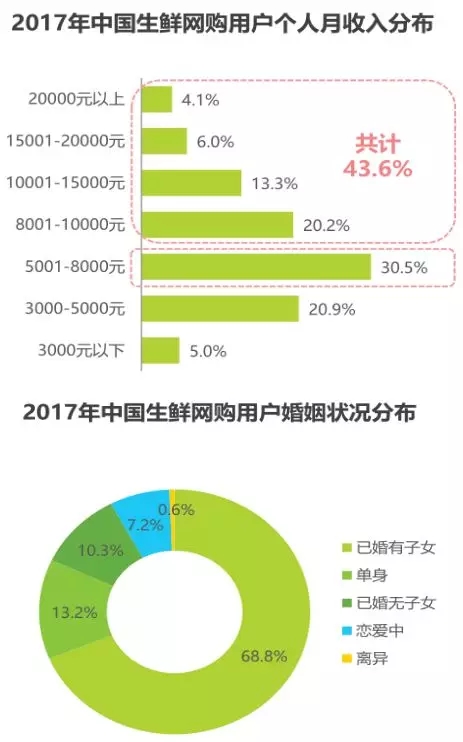 從用戶屬性來看,體驗過創(chuàng)新模式的用戶中高學歷、高家庭月收入的人群占比均高于整體生鮮網(wǎng)購用戶,與創(chuàng)新模式中高端消費者的定位相吻合。體驗過創(chuàng)新模式的用戶中78.2%擁有大學本科及以上學歷,80.7%的用戶家庭月收入在10000元以上,其中家庭月收入在10001-15000元的用戶最多,占比達28.2%。