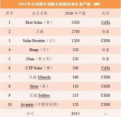 根據(jù)中國產(chǎn)業(yè)信息網(wǎng)資料顯示,3家公司產(chǎn)量約占全球薄膜電池產(chǎn)量的70%。根據(jù)中國光伏行業(yè)協(xié)會數(shù)據(jù)顯示,3家公司2016年產(chǎn)能占全球主要薄膜太陽能電池總產(chǎn)能的80%。