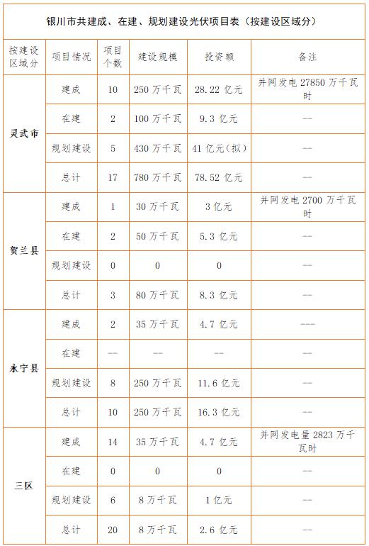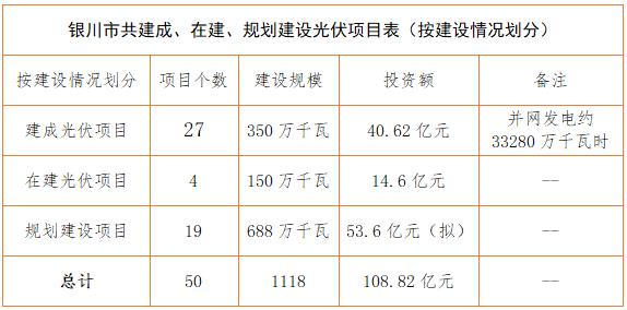 銀川市發(fā)改委項目資料顯示情況:截止2017年上半年,銀川市共建成、在建、規(guī)劃建設(shè)光伏項目50個,建設(shè)規(guī)模1118萬千瓦,投資約108.82億元。