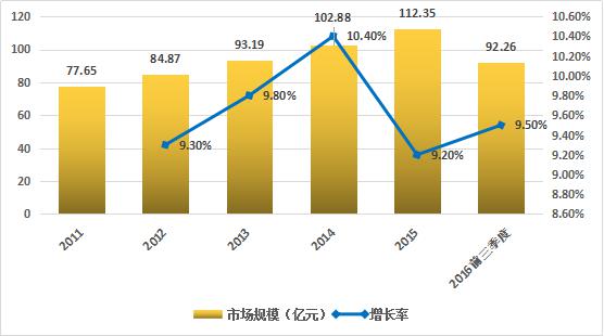 據(jù)統(tǒng)計,2011-2016年前三季度全球α-亞麻酸行業(yè)市場規(guī)模增長率在9%以上。其中,2014年全球α-亞麻酸行業(yè)市場規(guī)模102.88億元,2015年全球α-亞麻酸行業(yè)市場規(guī)模112.35億元,同比增長9.2%。行業(yè)市場增長速度較快,發(fā)展前景較好。