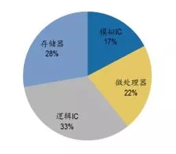 從進口集成電路產(chǎn)品的類別來看,微處理器/控制器進口額位列榜首,2014年價值高達1052.2億美元,占比48.33%;接著是半導(dǎo)體存儲器,2014年價值達542.8億美元,占比24.93%,之后是放大器,占比4.13%。