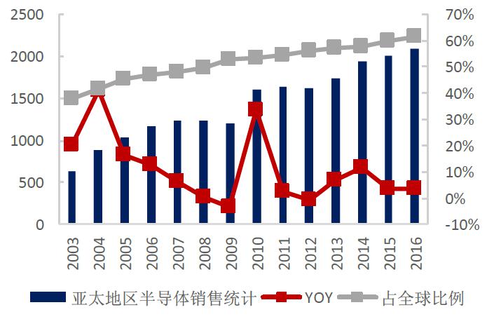 分區(qū)域來看,亞太地區(qū)主導(dǎo)地位日益顯著,占全球市場的比例有望保持在60%。全球半導(dǎo)體市場主要分布于美洲、歐洲、日本和亞太地區(qū),且市場格局相對清晰。亞太地區(qū)為第一大市場,占據(jù)全球50%以上的市場份額,其次為美洲市場,約占全球市場的20%,再者為歐洲和日本市場,兩者體量相當,均約占全球市場的10~12%。