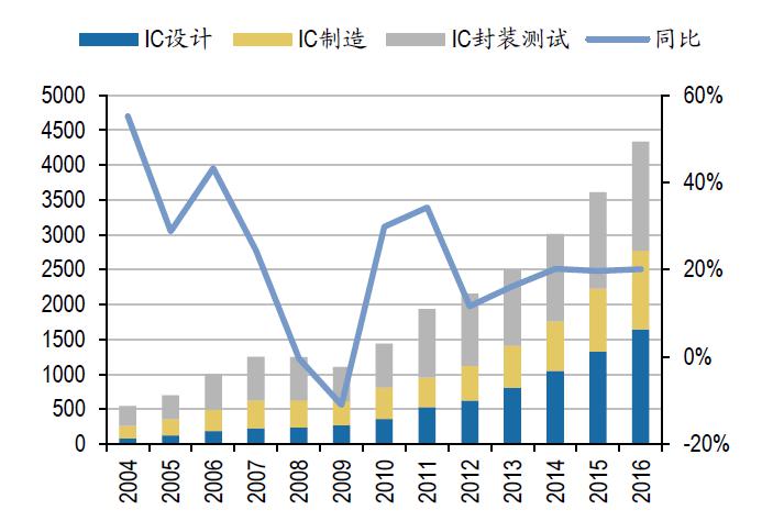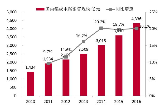 2016年中國集成電路產(chǎn)業(yè)繼續(xù)高速增長的勢頭,從半導(dǎo)體行業(yè)協(xié)會的2017年最新統(tǒng)計,2016年中國集成電路產(chǎn)業(yè)銷售額高達4335.5億元,比2015年增長20.1%。