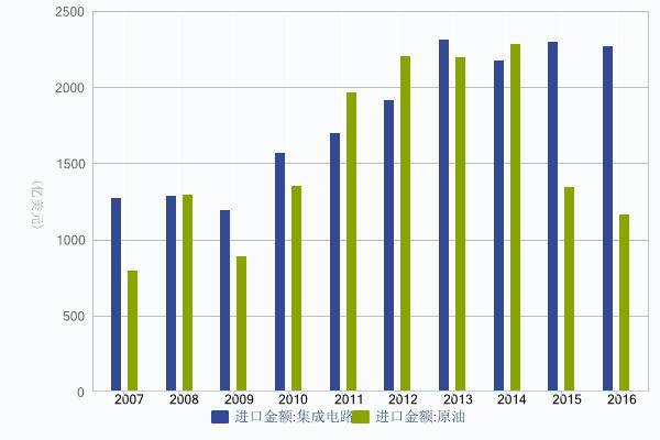 中國集成電路的進口持續(xù)維持高位。2016年,集成電路進口額達到2270.7億美元,比上年下降了1.2%,但是也連續(xù)四年超過了2000億美元,是價值最高的進口商品。同期出口集成電路613.8億美元,下降11.1%,貿(mào)易逆差高達1657億美元。預(yù)計未來幾年,集成電路進口額仍將維持高位。