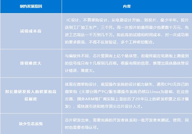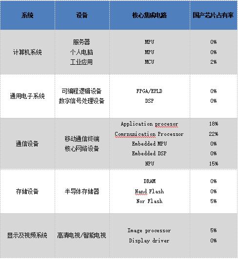 表中計算機系統(tǒng)中的MPU、通用電子系統(tǒng)中的FPGA/EPLD和DSP、通信裝備中的 Embedded mpu和DSP、存儲設(shè)備中的DRAM和 Nand flash、顯示及視頻系統(tǒng)中的 Display driver,國產(chǎn)芯片占有率都是零這就指出了一個嚴峻的問題,我國所需核心芯片主要依賴進口。半導(dǎo)體產(chǎn)業(yè)關(guān)系國家經(jīng)濟和安全命脈,中國半導(dǎo)體從業(yè)者身肩重責,必須為核心芯片國產(chǎn)化不斷努力。