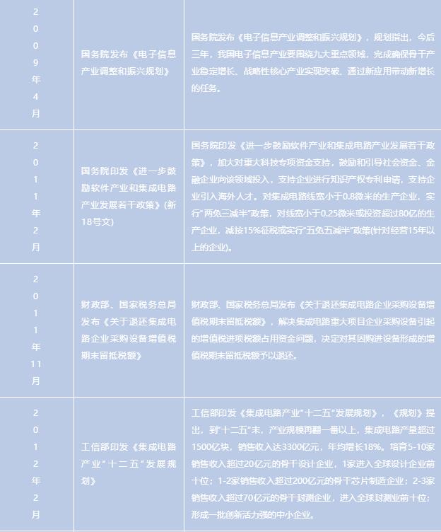 2011年出臺的《國務(wù)院關(guān)于印發(fā)進一步鼓勵軟件產(chǎn)業(yè)和集成電路產(chǎn)業(yè)發(fā)展若干政策的通知》,提出要大力支持軟件和集成電路重大關(guān)鍵技術(shù)的研發(fā),努力實現(xiàn)關(guān)鍵技術(shù)的整體突破,加快具有自主知識產(chǎn)權(quán)技術(shù)的產(chǎn)業(yè)化和推廣應(yīng)用,重點支持高端芯片、集成電路裝備和工藝技術(shù)、集成電路關(guān)鍵材料、關(guān)鍵應(yīng)用系統(tǒng)的研發(fā)以及重要技術(shù)標準的制訂;在《電子信息制造業(yè)“十二五”發(fā)展規(guī)劃》和《集成電路產(chǎn)業(yè)“十二五”發(fā)展規(guī)劃》中也均提出要著力發(fā)展芯片設(shè)計業(yè),壯大芯片制造業(yè),開發(fā)髙性能集成電路產(chǎn)品,增強先進和特色工藝能力。