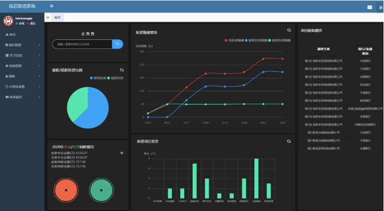 為進一步全面推進集團公司國企改革三年行動工作落實落地,積極探索公司數(shù)字化轉(zhuǎn)型新路徑,推動數(shù)字經(jīng)濟與風(fēng)險防控深度融合,著力提升公司合規(guī)風(fēng)控及投后管理的標(biāo)準(zhǔn)化、規(guī)范化、信息化水平,銀川智慧信息科技有限公司根據(jù)集團公司關(guān)于國企改革、數(shù)字化轉(zhuǎn)型和高質(zhì)量發(fā)展的整體工作部署,打造了投后管理系統(tǒng)平臺,目前,已正式投入使用。平臺旨在通過投后管理系統(tǒng)平臺進行良好的投后管理,為化解風(fēng)險提供精準(zhǔn)有效的數(shù)據(jù)支撐,減少或消除潛在投資風(fēng)險,保障國有投資安全,實現(xiàn)國有資產(chǎn)的保值增值。